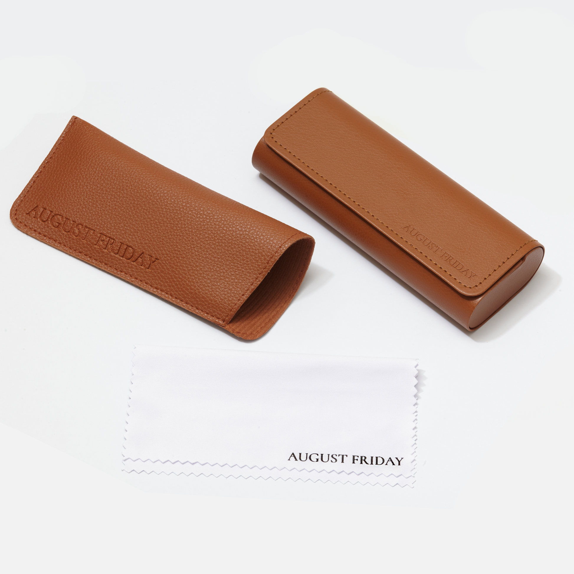 For those who like a little bit more protection for their eyewear, this structured case in smooth caramel brown is designed to be compact yet sturdy. Finished in smooth vegan leather with the AUGUST FRIDAY logo hand embossed on the front.